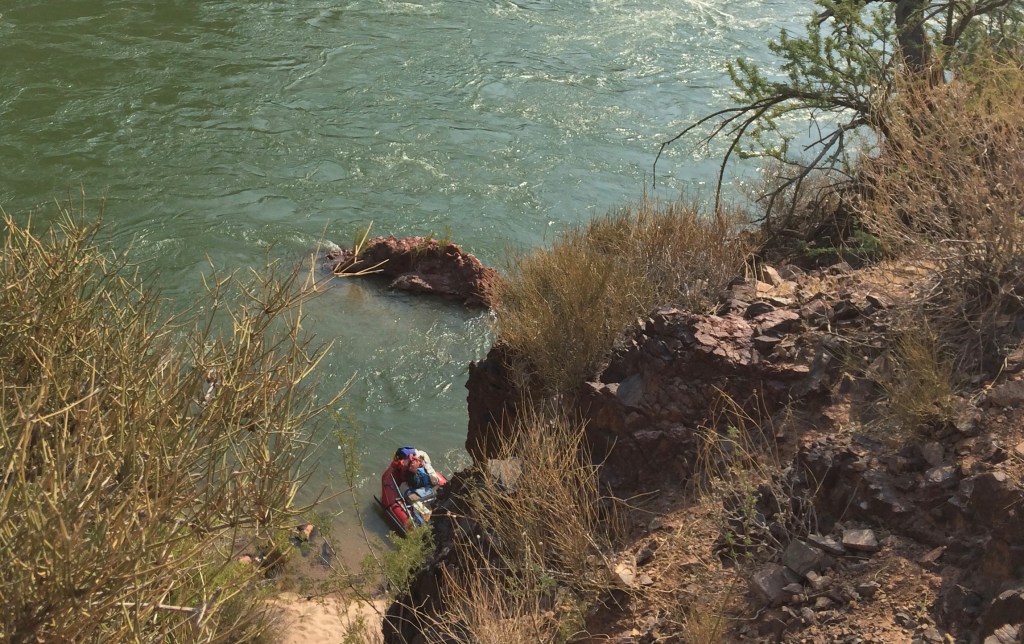 The Zoroaster Granite tapered off trailside. Was this it? I hiked up to Tapeats Narrows and followed the trail back down. After a few passes up and down trail, it seemed consistent that the rocks embedded in the trail changed color where the Granite tapered off. A friend I met at camp arrived just in time to get a photo.