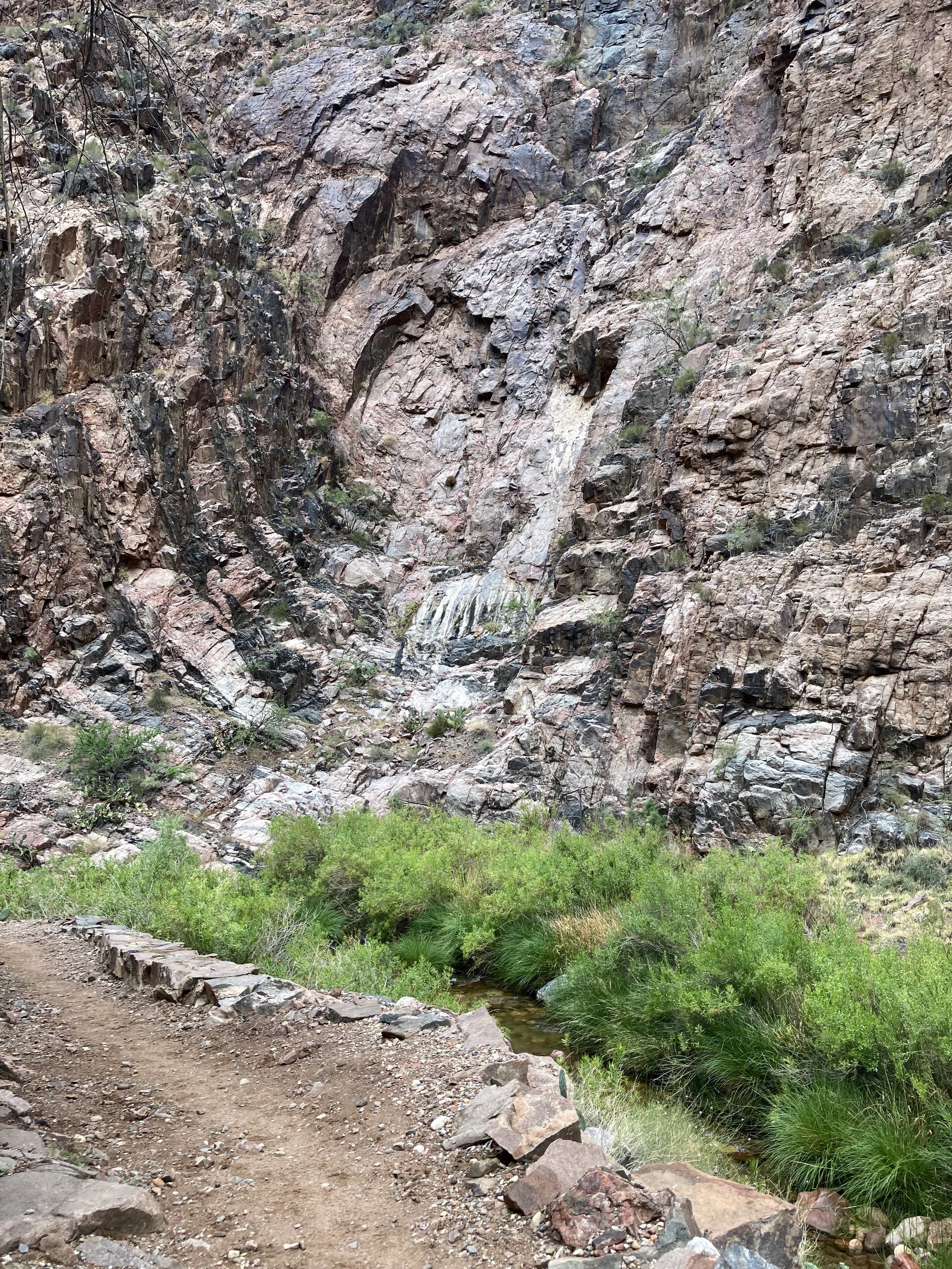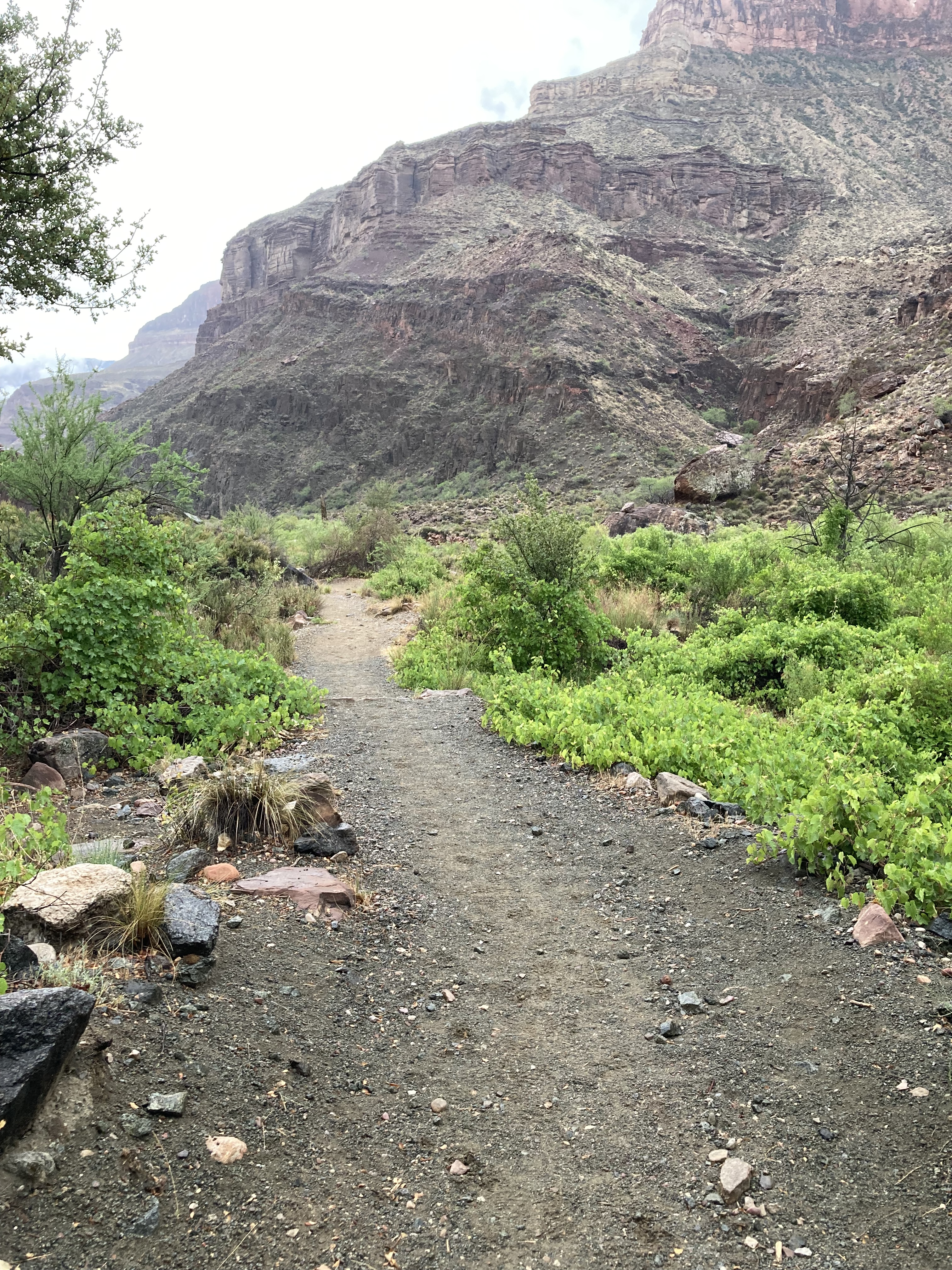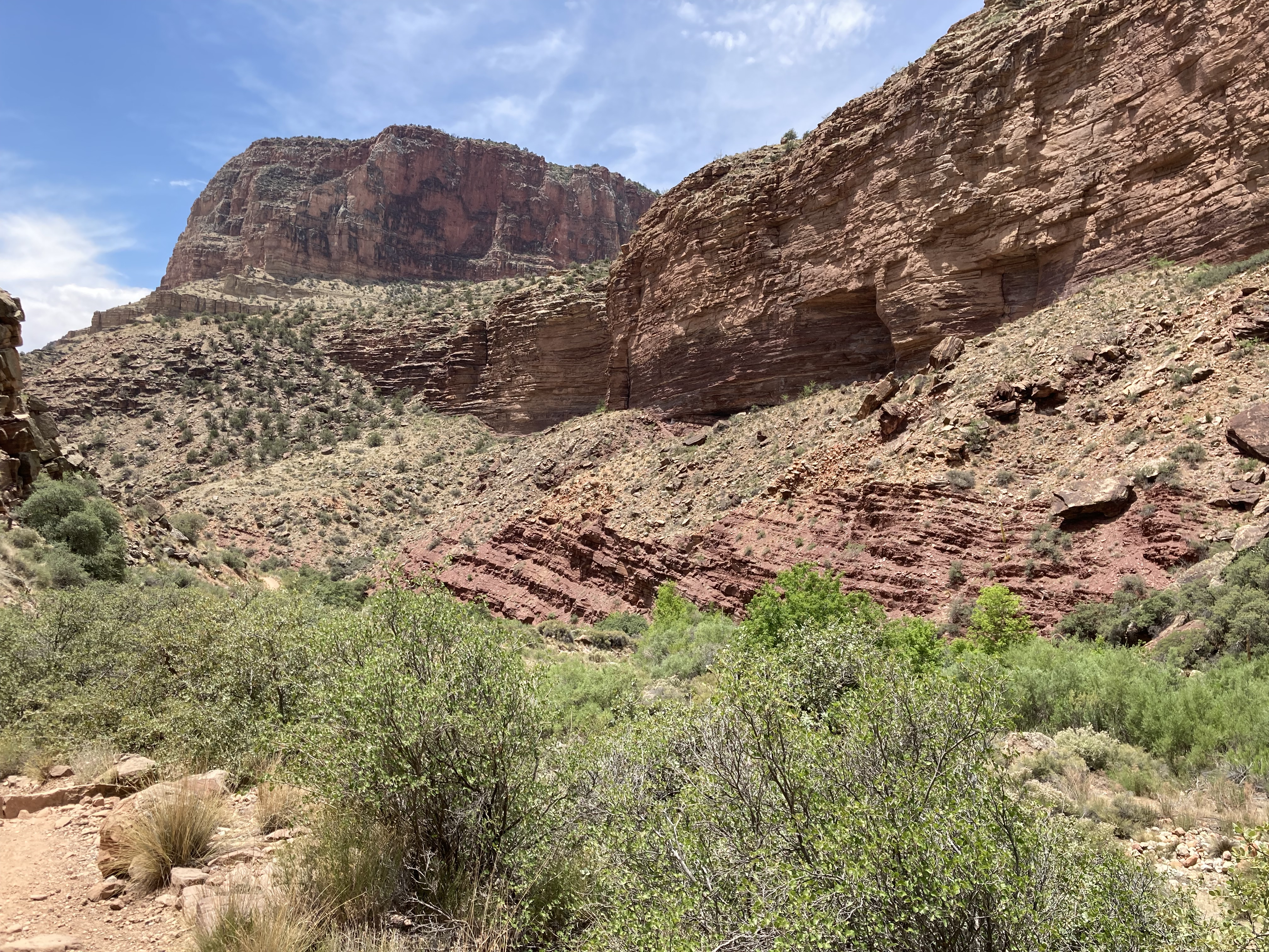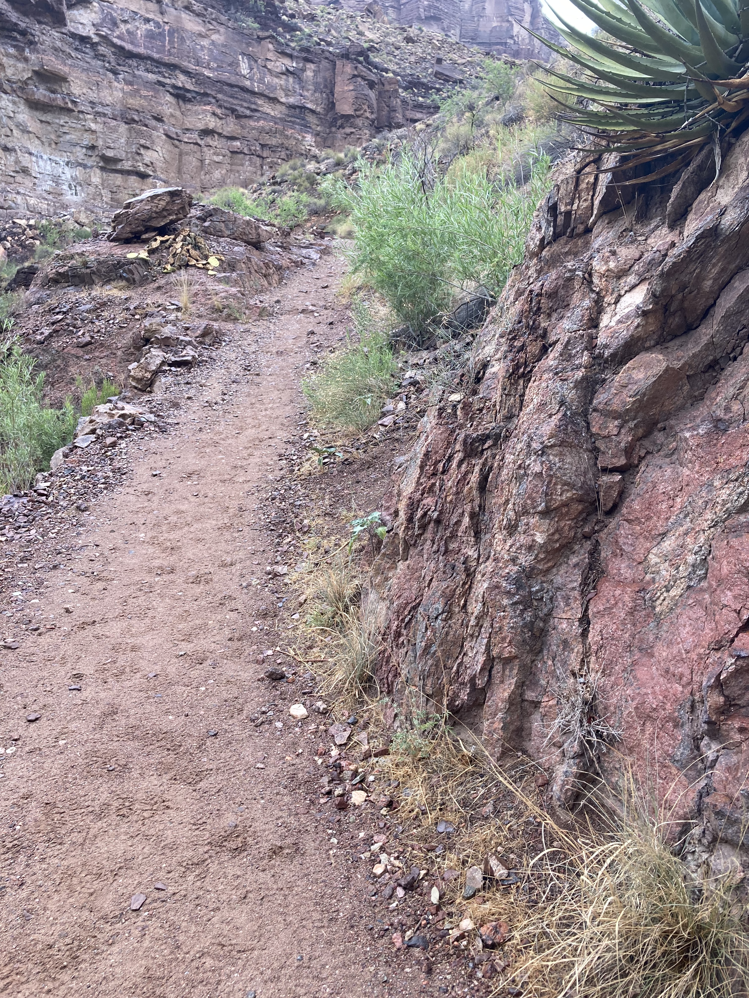The Great Unconformity – Tapeats ends below the narrows. Reddish brown granitic basement rocks (Xgr) appear trailside Right and continue through a lush area of creek crossings. The Great Unconformity is highly visible across the creek on the underside of Plateau Point where the west side of the BA fault is higher in elevation.