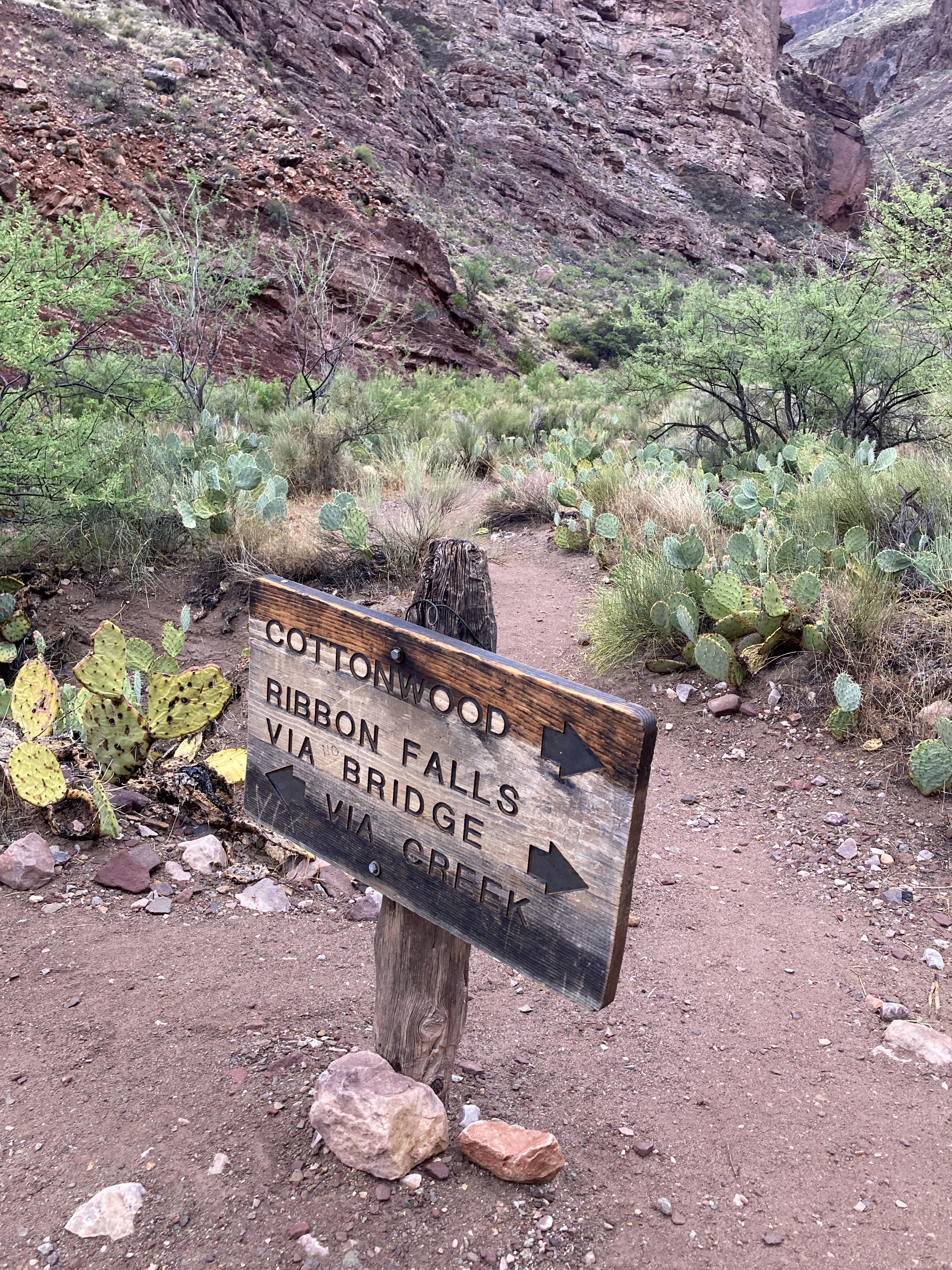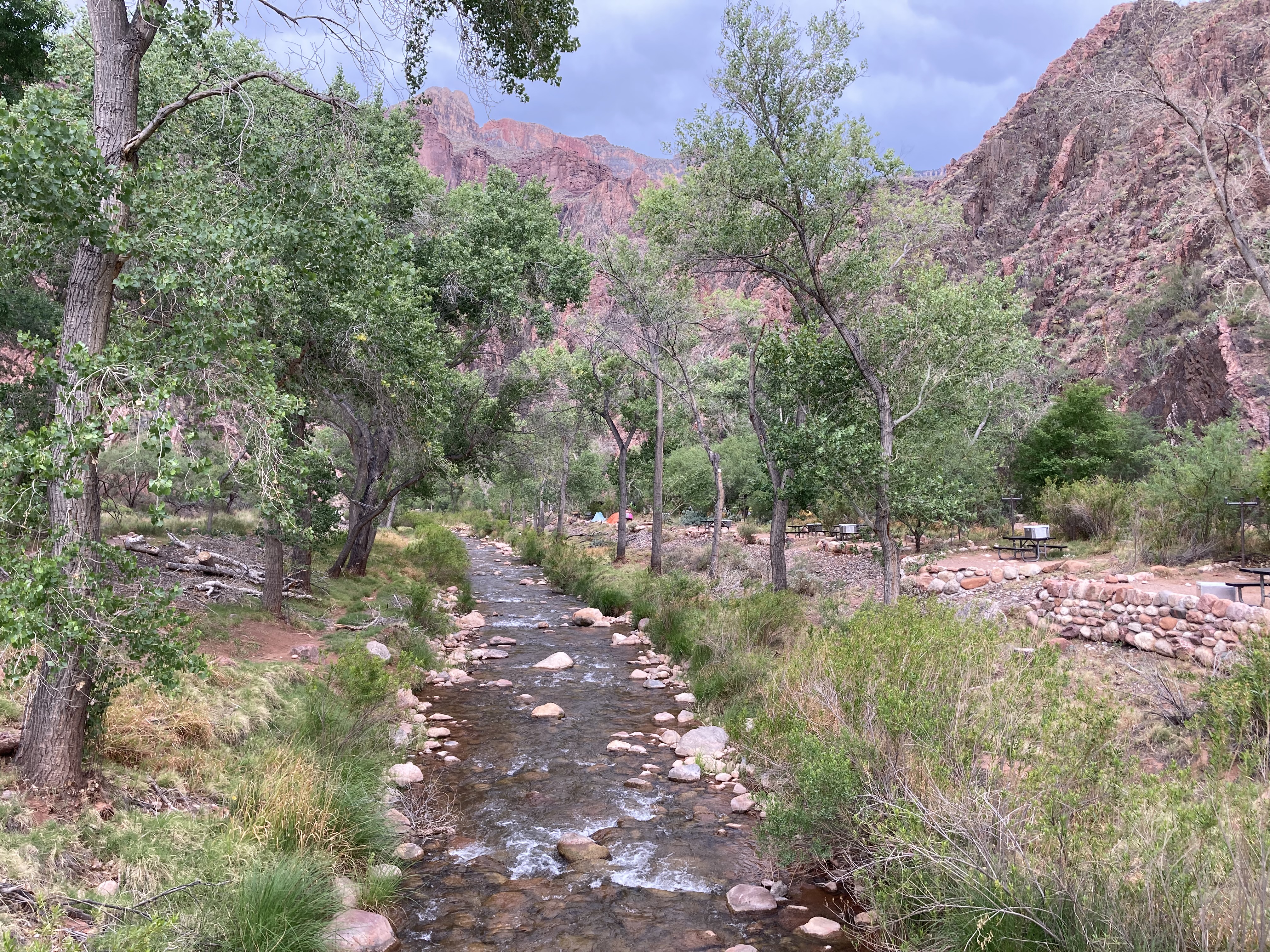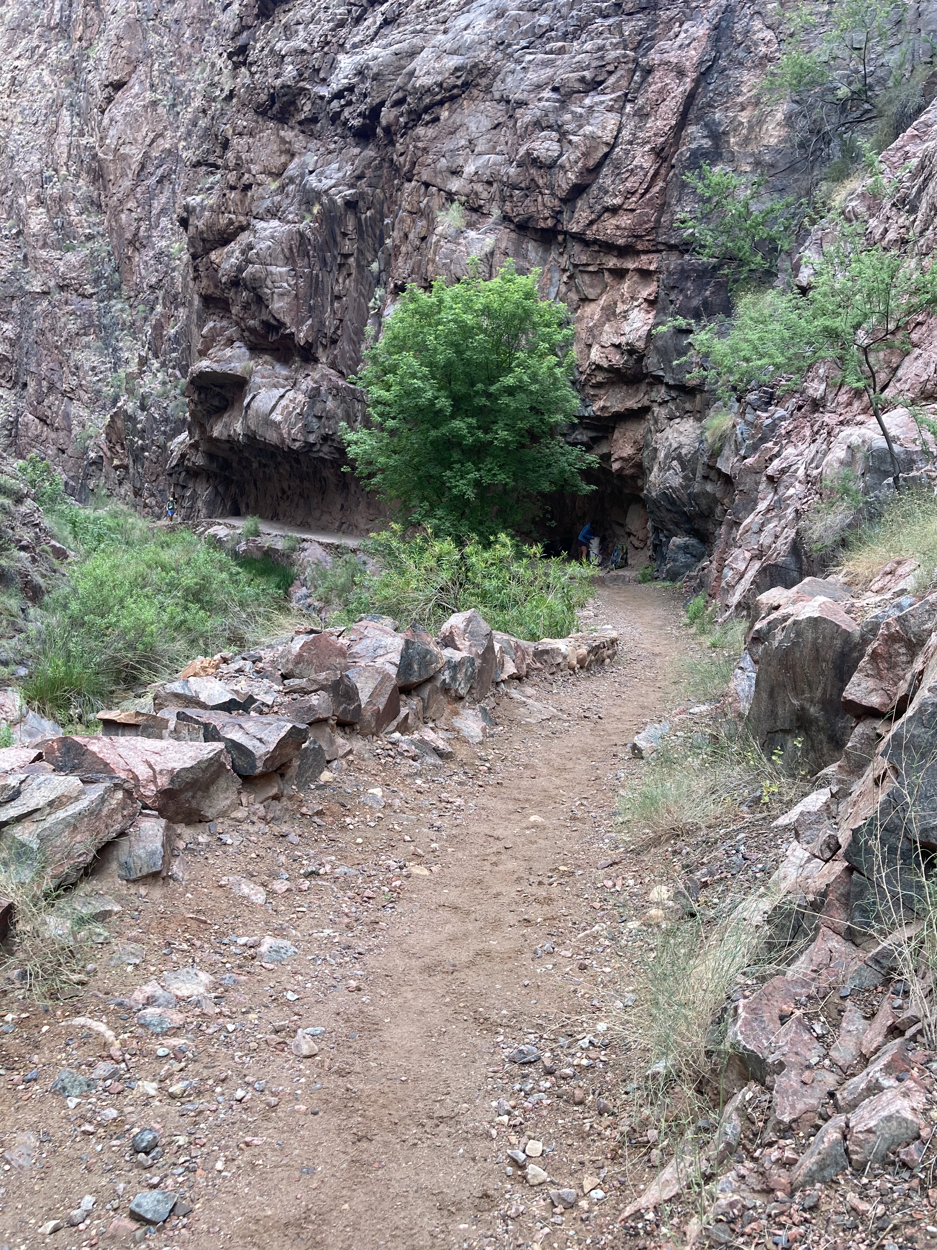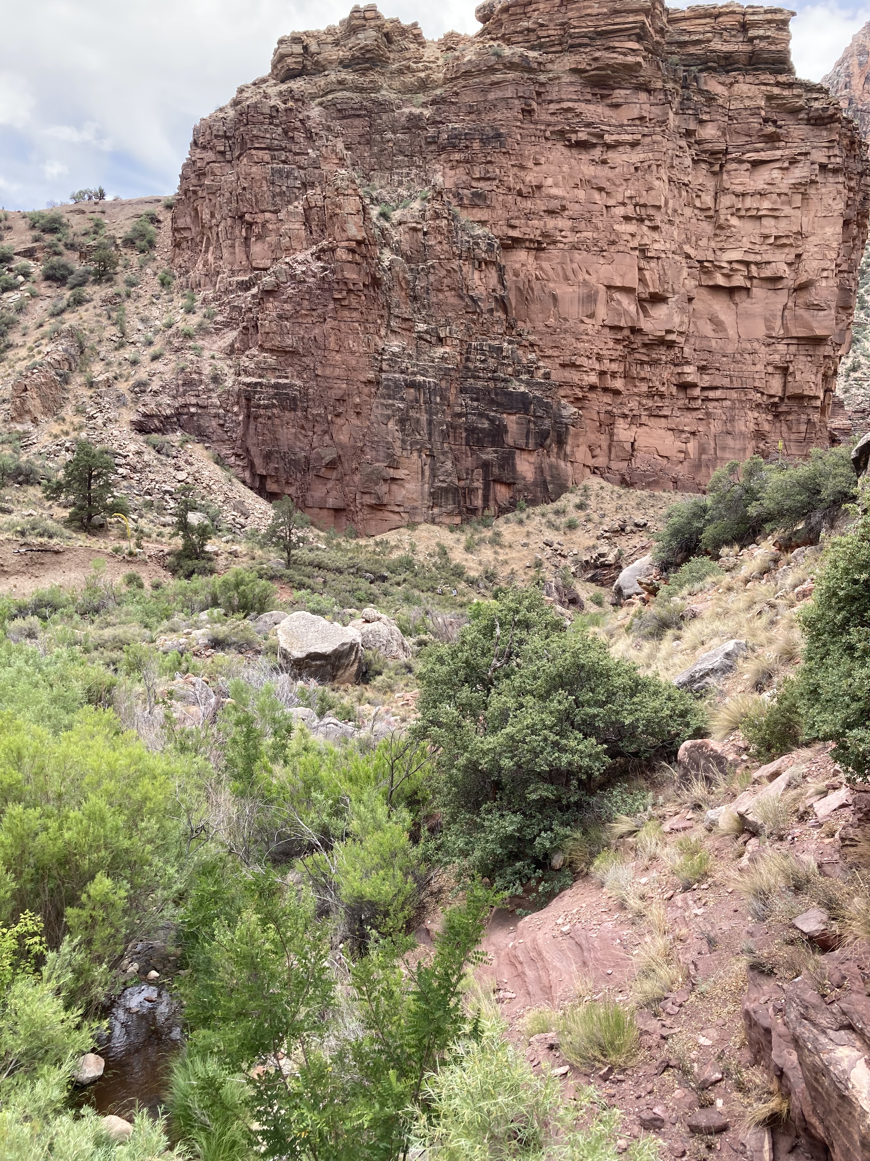 The Great Unconformity – Tapeats ends below the narrows. Reddish brown granitic basement rocks (Xgr) appear trailside Right and continue through a lush area of creek crossings. The Great Unconformity is highly visible across the creek on the underside of Plateau Point where the west side of the BA fault is higher in elevation.