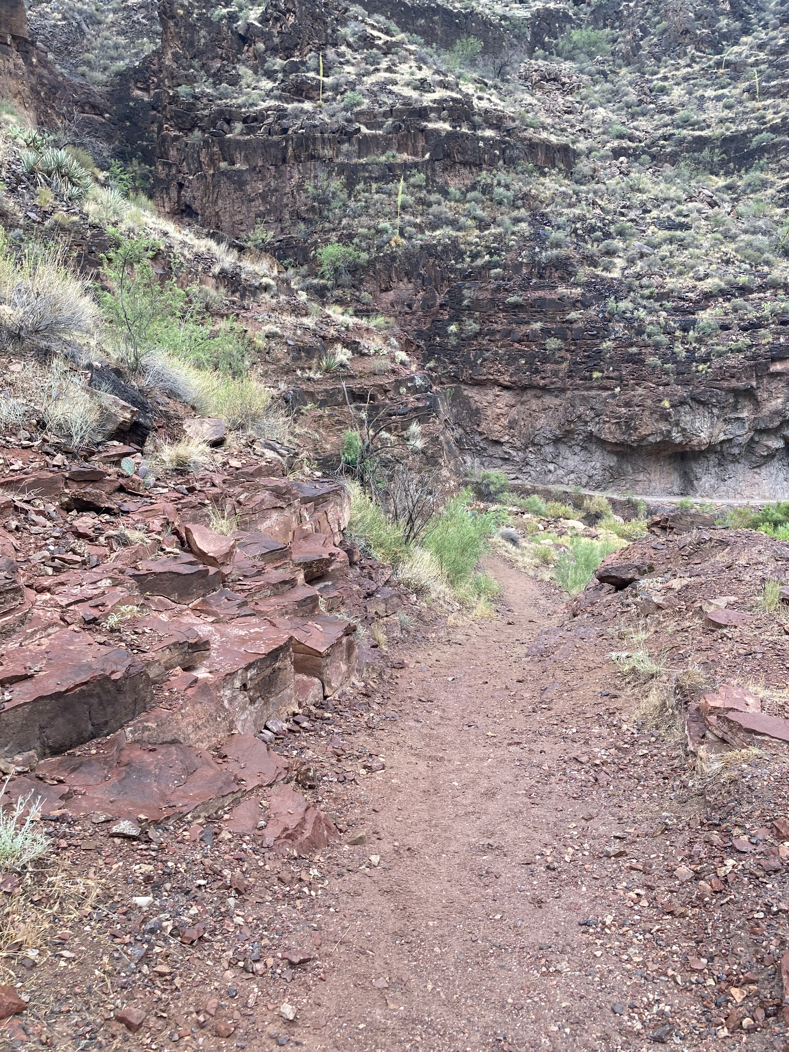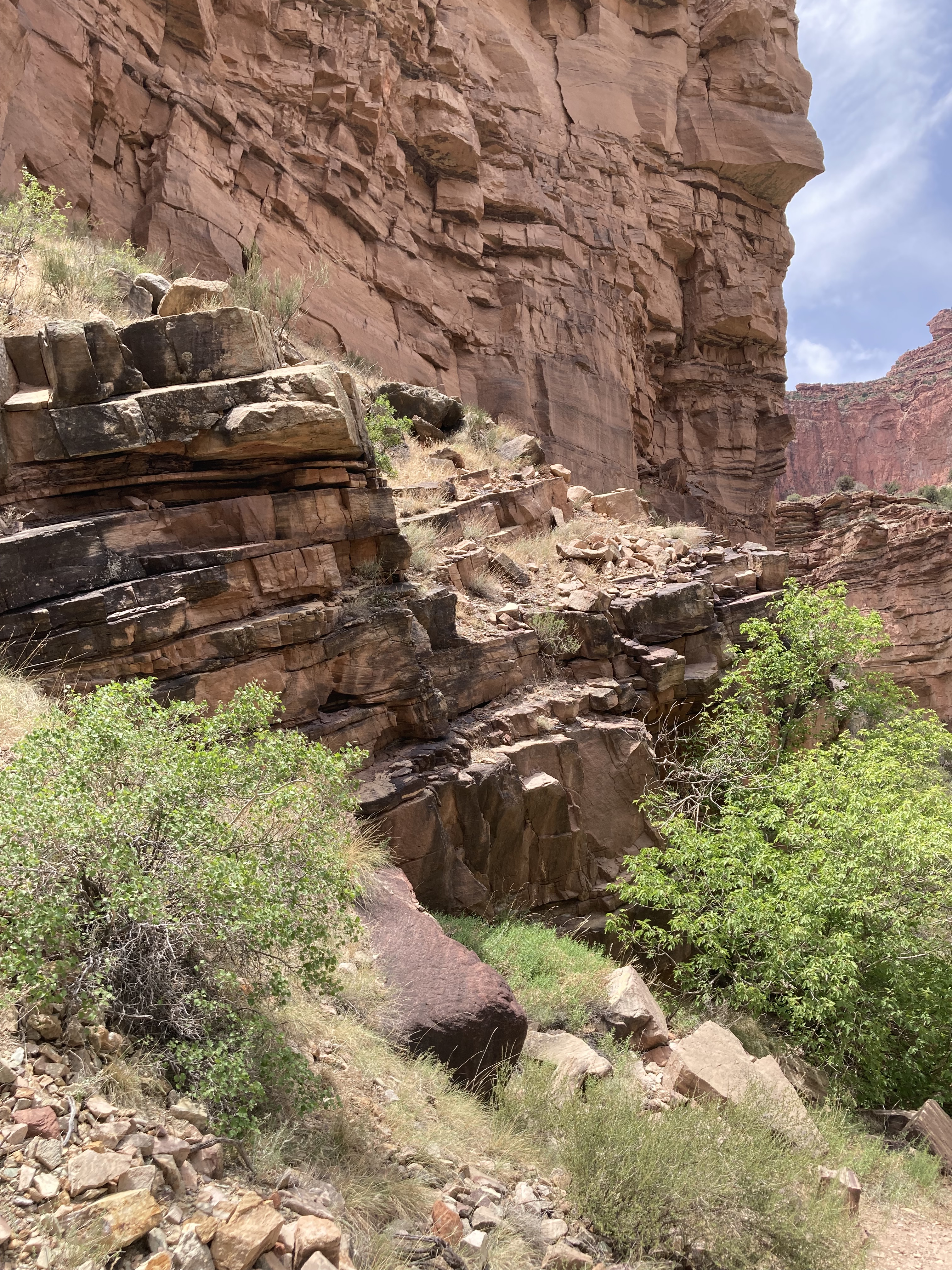 Muav Formation 504 – continues descending steeply via two short switchbacks before gradually opening into a gentle slope, appears beige from a distance