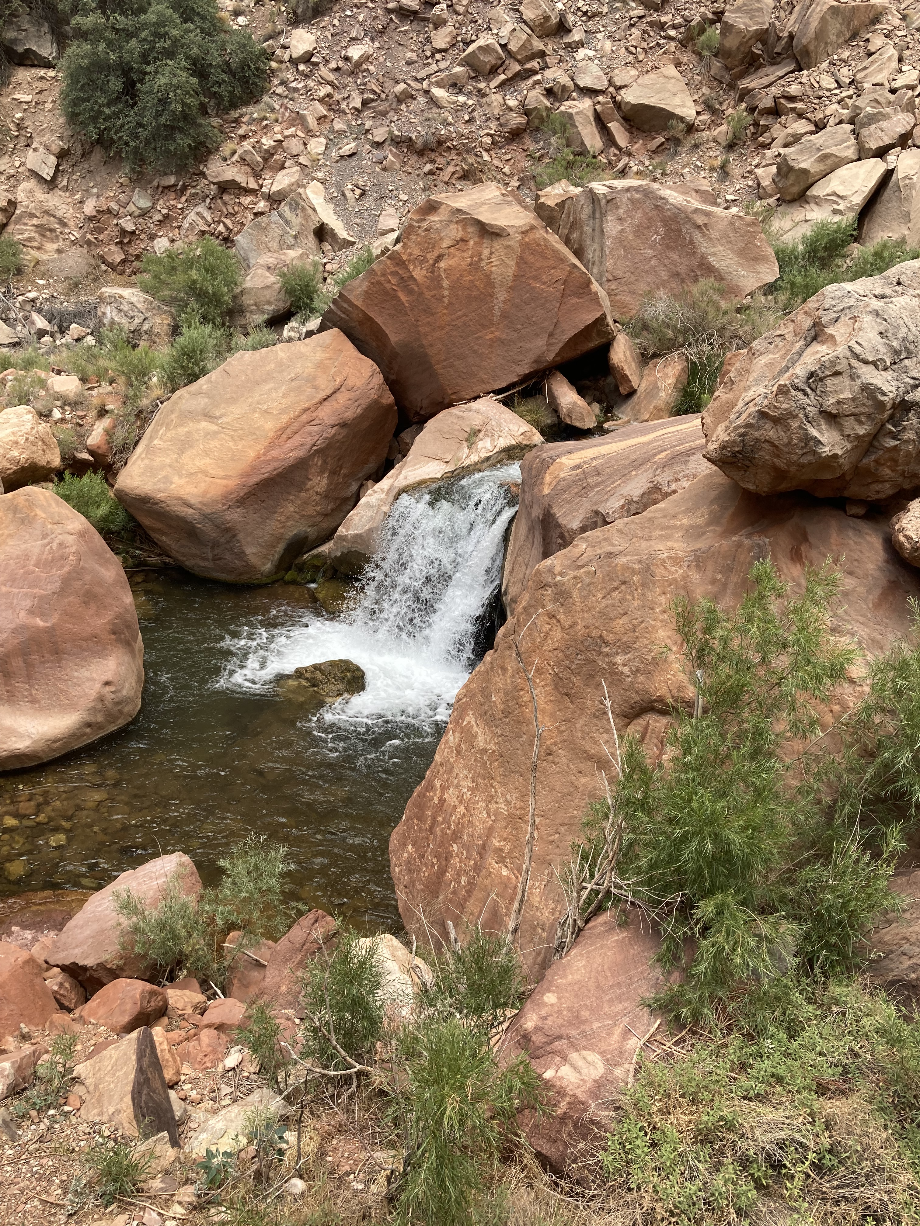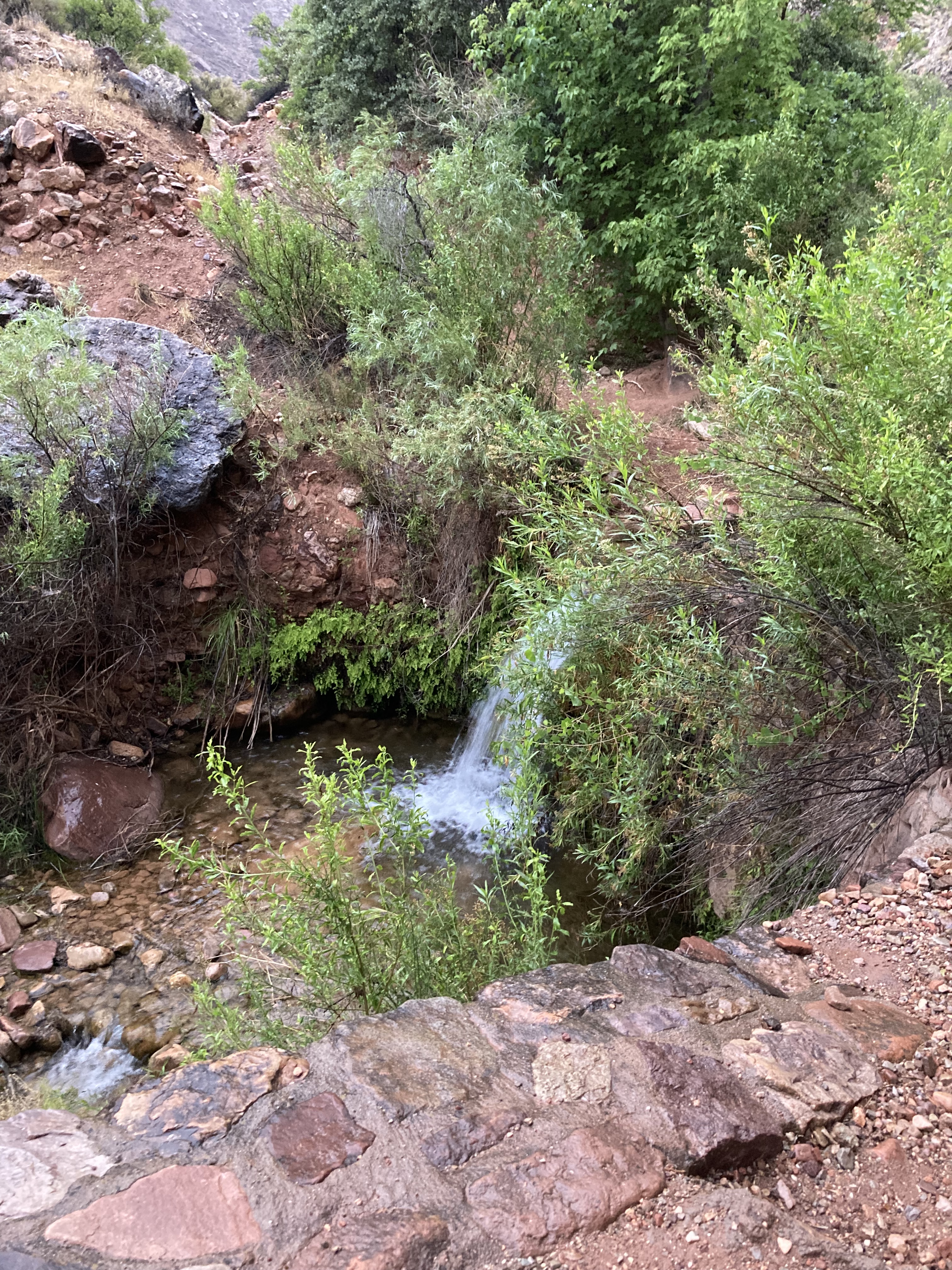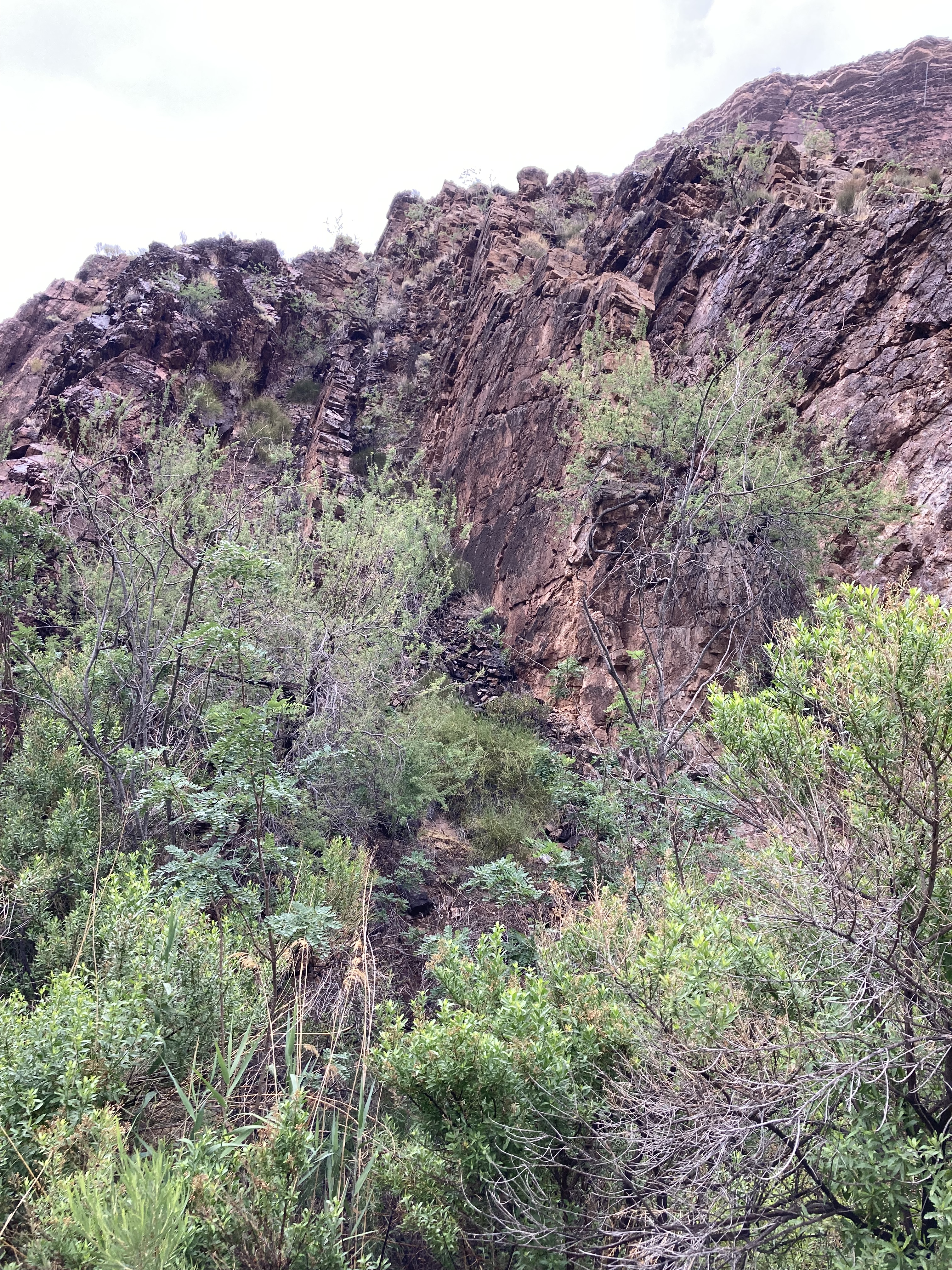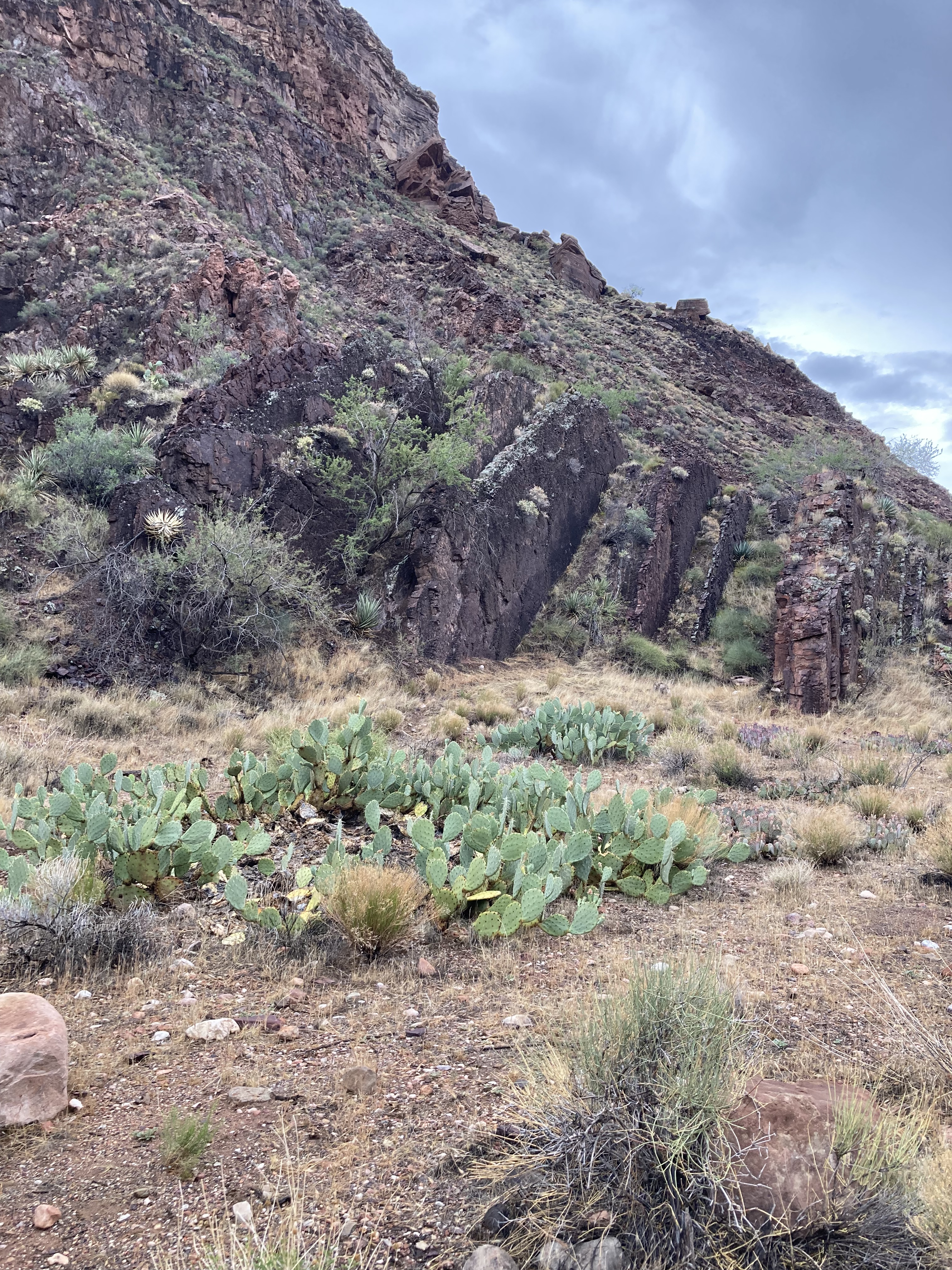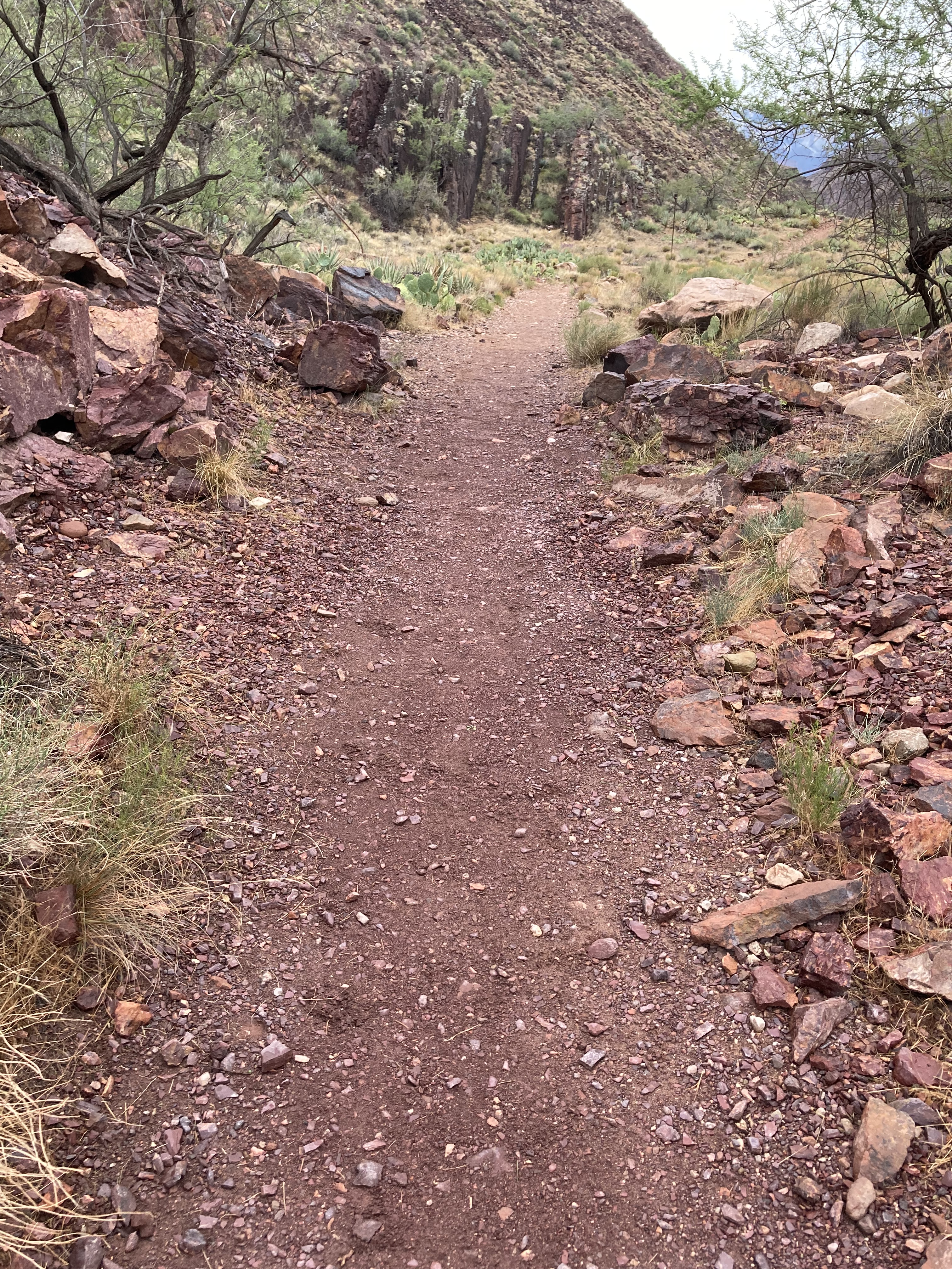 Below Tapeats the BA trail meanders through the reddish brown granitic rocks, soon reaching shallow water crossings in a shaded riparian area. The trail opens up on a ridge. Devil’s Corkscrew can be seen to the east. On the opposite side of the trail, Garden Creek begins its descent into Pipe Creek Canyon. A large trailside rock provides shade or a place to sit to lean. The trail turns right into Devil’s Corkscrew.