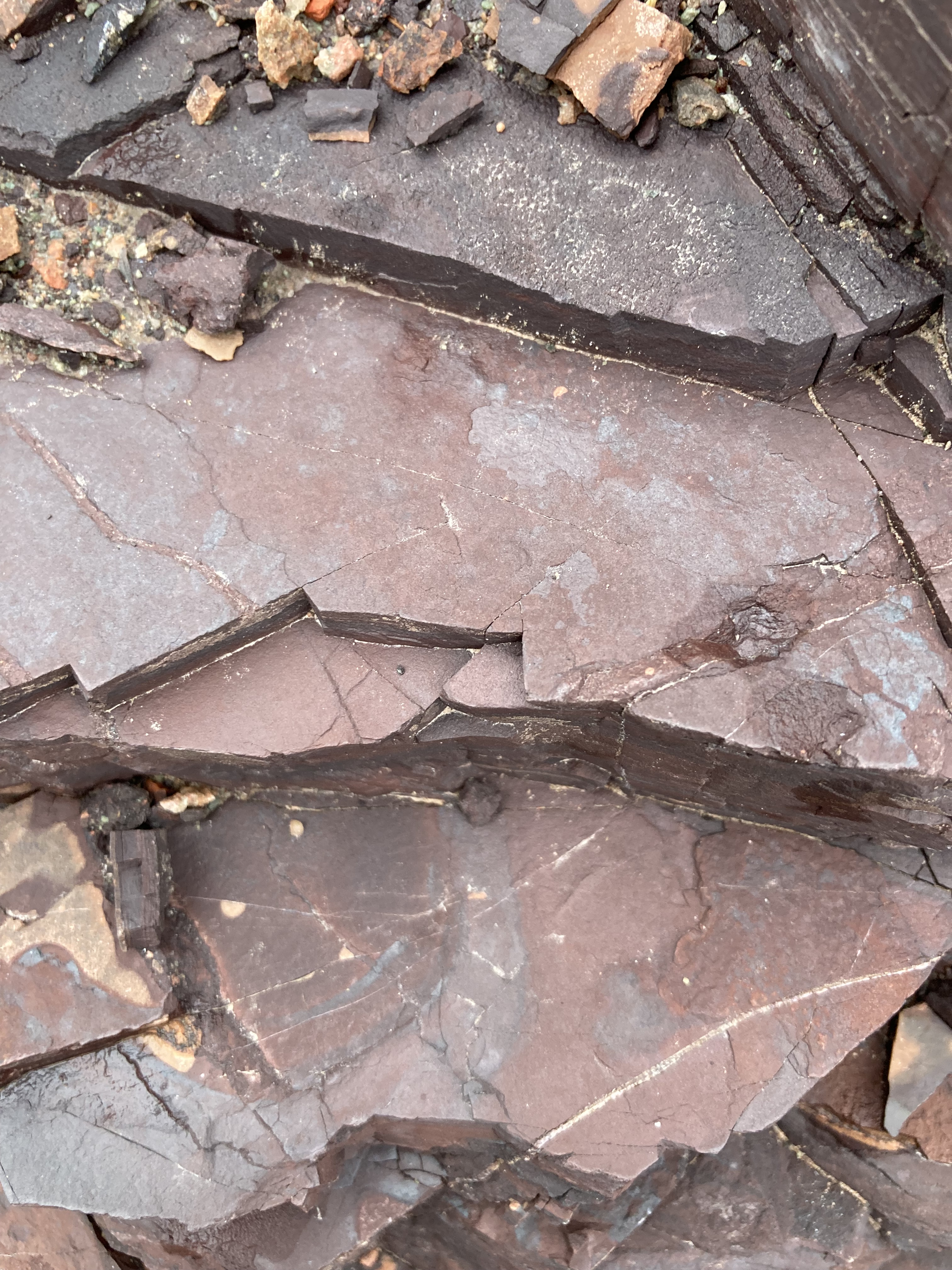 Hakatai (Yd) 1230 Ma – 1) The upper Hakatai on NK Trail starts at the bottom of the landslide deposits descending Asinine Hill. 2) Below the lower junction for Ribbon Falls the trail crosses into a long stretch of 3) course black or dark gray Unnamed diabase sills and dikes (Yi) 1070 Ma. 4) The trail crosses into the red Hakatai again just above the vertical Bass Rocks.
