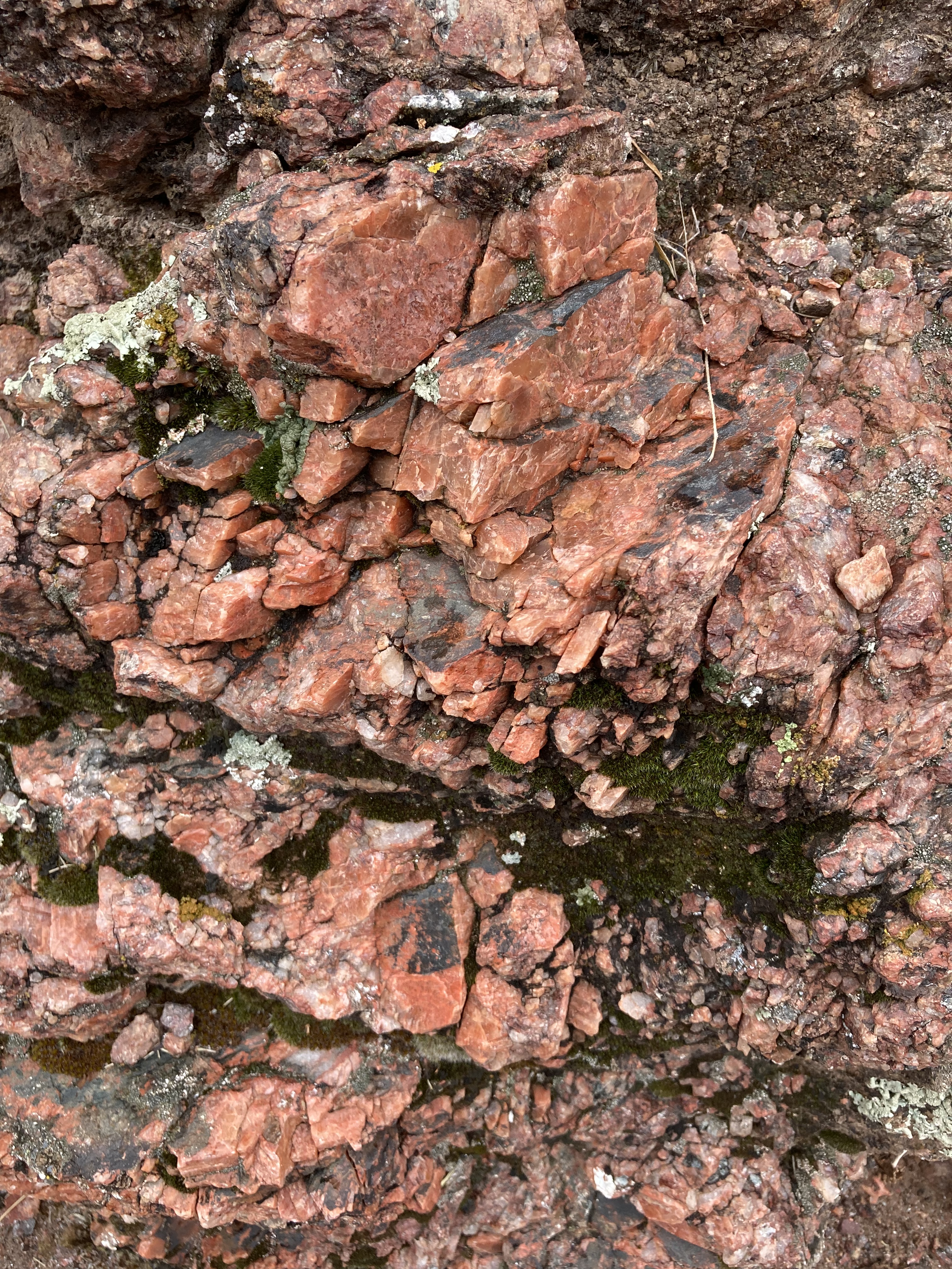 Shinumo (Ys) 1130 Ma – Most of the trail below the confluence of Bright Angel Creek & Wall Creek is in beige-pink-purple Shinumo until the ascent of a hill of landslide deposits (‘Asinine Hill’) just left of the sign at the upper Jct of the spur trail to Ribbon Falls.